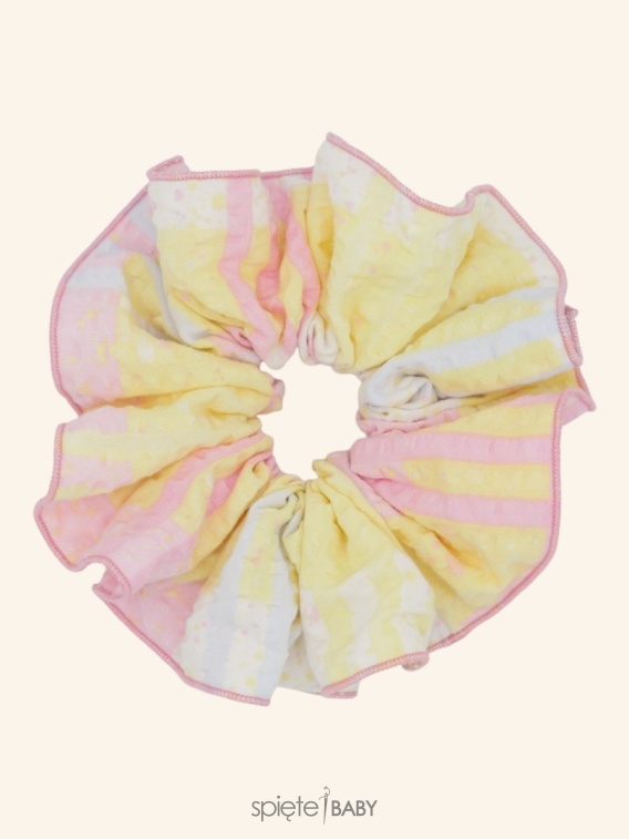 Gumki uszyłam z materiału z drugiej ręki. Bardzo dobrze trzymają fryzurę, niezależnie od gęstości włosów.